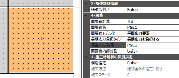 「構造スラブ符号」は上記の面要素の計算に関わらず、剛性計算用のスラブ厚さを個別指定する時に使用します。 「面要素名」と「構造スラブ符号」で異なる符号を設定した時は「構造スラブ符号」の厚さが採用されます。
