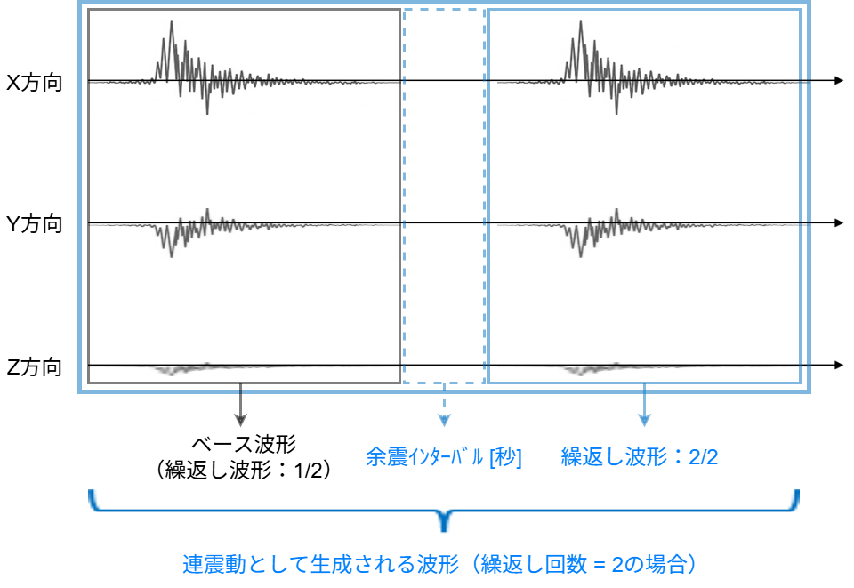 開始時刻0秒から終了時刻t_end(「振動解析ケース設定」で指定)までの波をベースに指定回数繰り返し、繰り返し波形の間に(指定回数ー1)回の余震インターバルを入れた連震動を作成します。