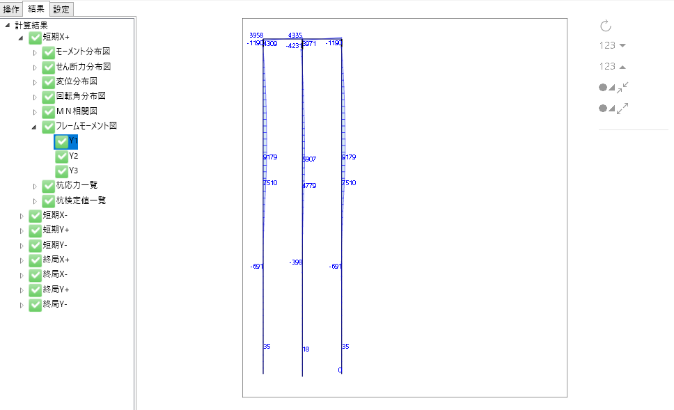 計算結果を画面から確認します。 分布図、MN相関図、フレーム形式応力図、応力・検定値のテーブル形式まとめ表が表示できます。